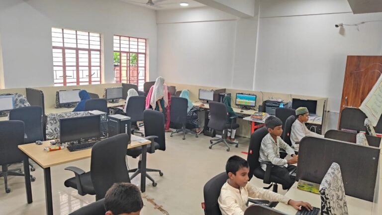 The computer lab provides students with essential digital literacy skills, ensuring they are prepared for the challenges of the modern world. Equipped with the latest systems, internet access, and necessary software, the lab supports learning in programming, MS Office, graphics, and networking basics. Practical sessions allow students to practice theoretical concepts and gain confidence in using technology. Guidance from skilled teachers ensures every student, even from rural backgrounds, masters digital skills. This facility bridges the gap between traditional madrasa education and modern professional requirements, empowering students to compete in exams and careers where IT proficiency is essential.